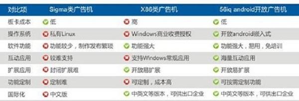 【最優(yōu)性價(jià)比】——性價(jià)比是56iq EC系列廣告機(jī)的一大優(yōu)勢。56iq EC83在前兩代廣告機(jī)的基礎(chǔ)上,不僅大大提升了廣告機(jī)的性能,還繼續(xù)保持著本系列廣告機(jī)的超高性價(jià)比。EC83開放廣告機(jī)擁有優(yōu)于插卡機(jī)的價(jià)格,更具有媲美windows機(jī)的性能。下圖是詳細(xì)的對(duì)比: